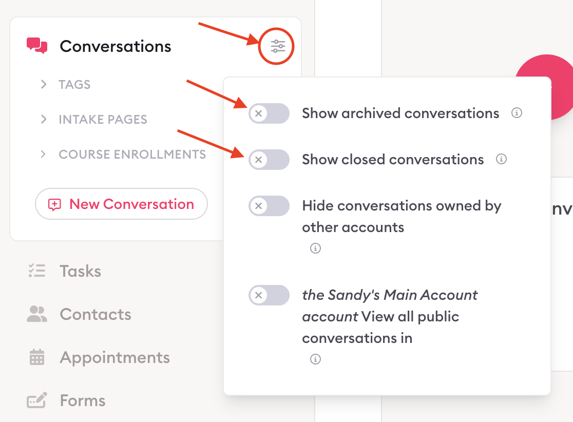 Turn on “Show closed conversations” to view conversations where replies are closed.